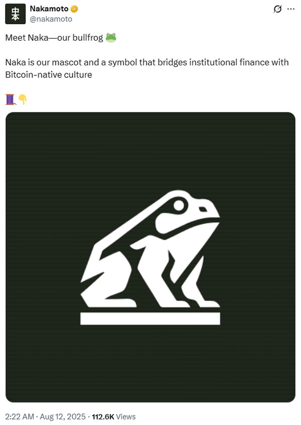 Nakamoto changed its mascot to a bullfrog on Monday, with Bailey explaining that it represents a “legendary treasure hoarder, an apex predator, an invasive species, and willing to eat anything that grows our Bitcoin per share.”