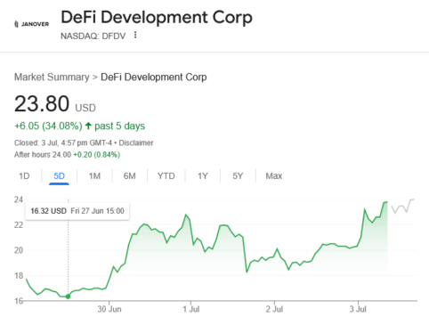 DeFi Development Corp. surged another 17% on Thursday after announcing it had purchased $2.7 million in Solana as part of its ongoing treasury strategy.ย