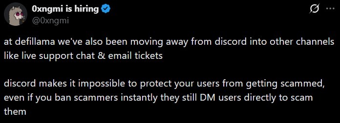 Similar concerns were raised by 0xngmi. In a post, the DefiLlama founder said their platform shifted toward live support chat and email tickets, arguing that Discord makes it impossible to protect users.