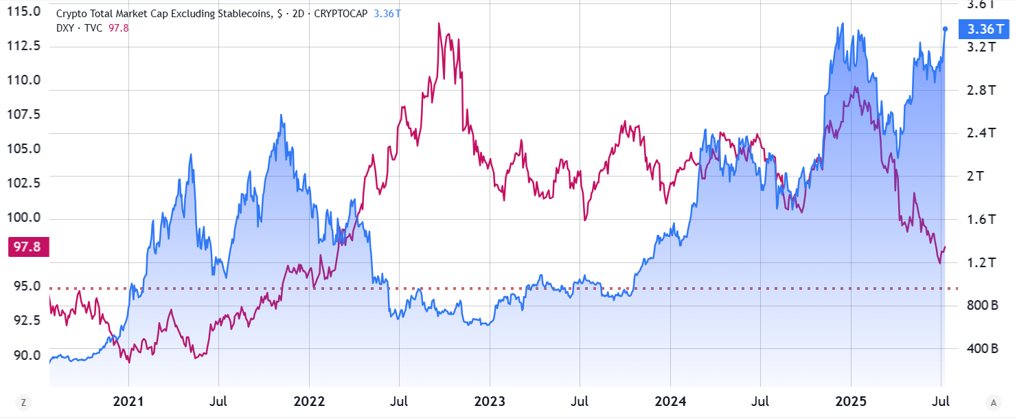 A weakening US dollar or major ETF adoption could push the crypto market cap well above its previous highs.