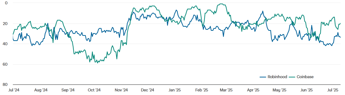 Retail investor participation also plays a critical role in triggering a supercycle. Search volumes for terms like “buy Bitcoin” and “buy crypto” have remained flat for five months and sit well below their November 2024 highs. Likewise, the Coinbase and Robinhood apps have slipped in US App Store rankings over the past three months.