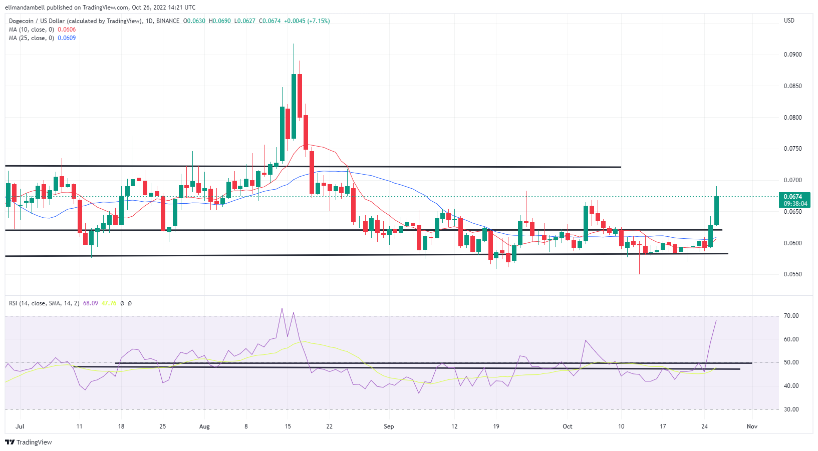 An upward crossover between the 10-day (red) and 25-day (blue) moving averages also seems imminent, which could lead to dogecoin climbing above $0.0700.