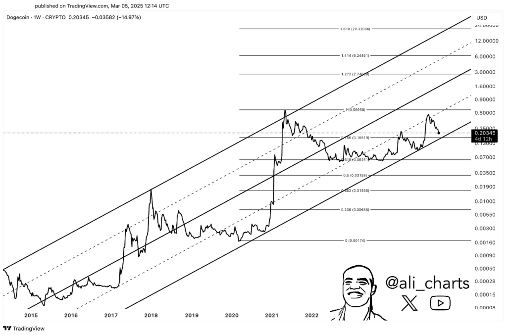 Right now, Dogecoin is trading at around $0.2067. The price is moving within an ascending parallel channel, according to Martinez. He identifies a crucial support level at $0.16, which could play a big role in determining the coin’s next move.
