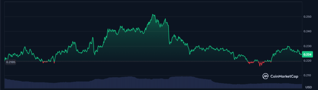 Dogecoin hovered around $0.22 between May 20 and May 26. It peaked at $0.25 on May 23, only to slip afterward. Then the last 24-hour gain of 4.1% showed it can bounce from support. The 5% weekly rise points to steady buying, even with some pullbacks in the middle of the week. Traders are watching for a daily close above $0.50 as a sign that the long squeeze is over.
