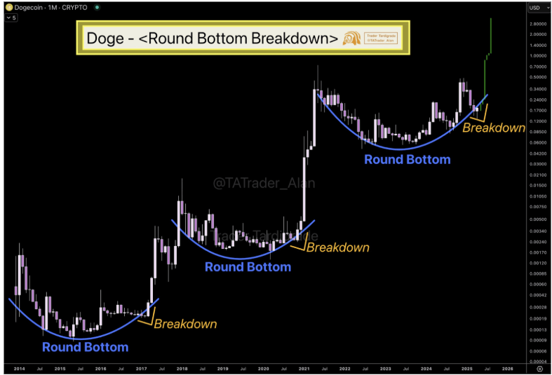 However, $0.25 is only the target in the short term. In a separate analysis, Trader Tardigrade pointed to Dogecoin’s long-term chart, highlighting a round bottom formation. The accompanying chart shows that in previous cycles, Dogecoin’s price formed a rounded bottom before entering explosive upward trends. This repeated pattern, now visible again on the monthly timeframe, signals that Dogecoin may be on the verge of another significant breakout. The long-term price target in this case is $2.8.