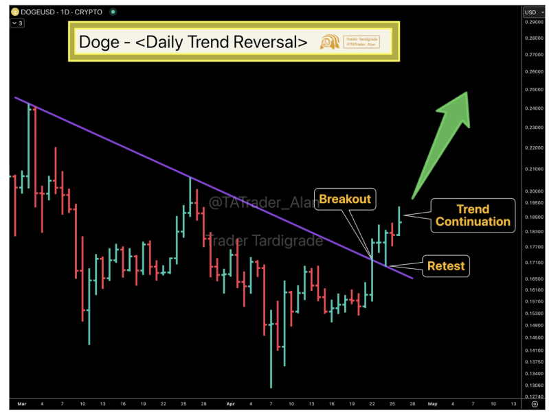 Shortly after breaching the downward sloping resistance line, Dogecoin’s price pulled back between April 23 and April 24 to retest the same trendline, but this time from above. Importantly, the former resistance trendline held strong as a new support level during the retest. Following that successful test, Dogecoin resumed its upward climb, marking the continuation of the new uptrend.