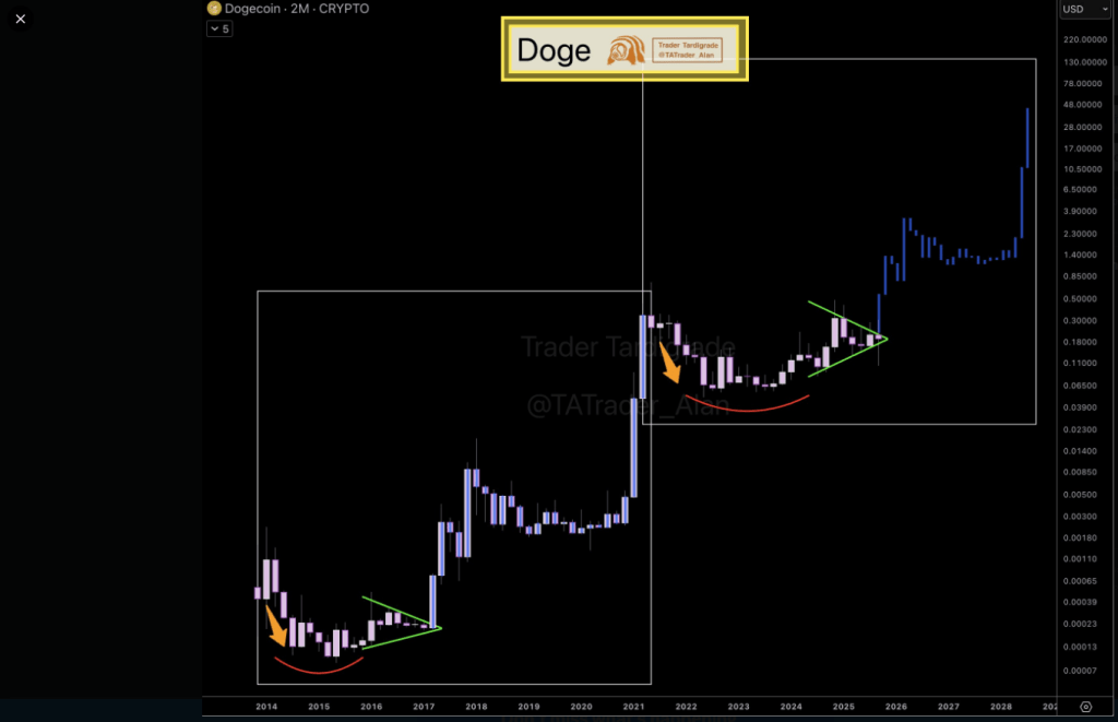 For a multi-thousand percent surge to happen, sustained buying and extended public attention would be required. At present, the view rests primarily on a visual similarity between past and present setups rather than on independent signals that a major rally is guaranteed.