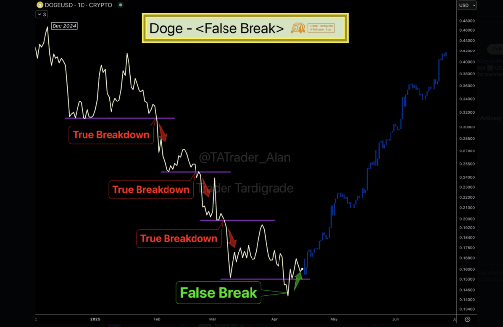 A standalone analysis by Trader Tardigrade indicates Dogecoin’s initial “false break” since December 2024. The cryptocurrency has, in general, traced a downtrend of lower highs and lower lows, which are common bearish market indicators. After dropping to $0.13 on April 7, though, the price did bounce briefly before declining once more.