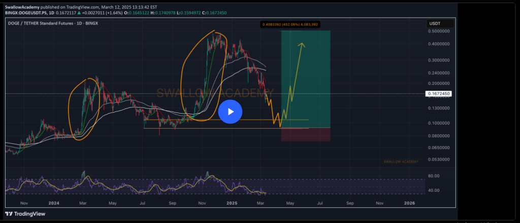 SwallowAcademy thinks that the same trend may develop in 2025. However, their prediction is that Dogecoin may decline another 40% to around $0.09, creating a zone of support before, possibly, skyrocketing 400% to $0.45. The price stands at over $0.15 currently, and the analyst is holding out for the anticipated drop to $0.09.