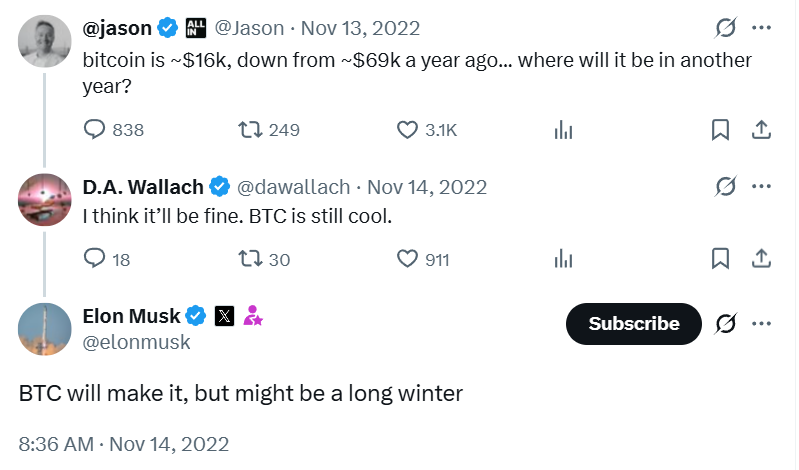 “BTC will make it, but might be a long winter,” wrote Musk in an X post on Nov. 14, 2022, in response to Bitcoin hitting the previous bear market’s lowest point of $16,000.
