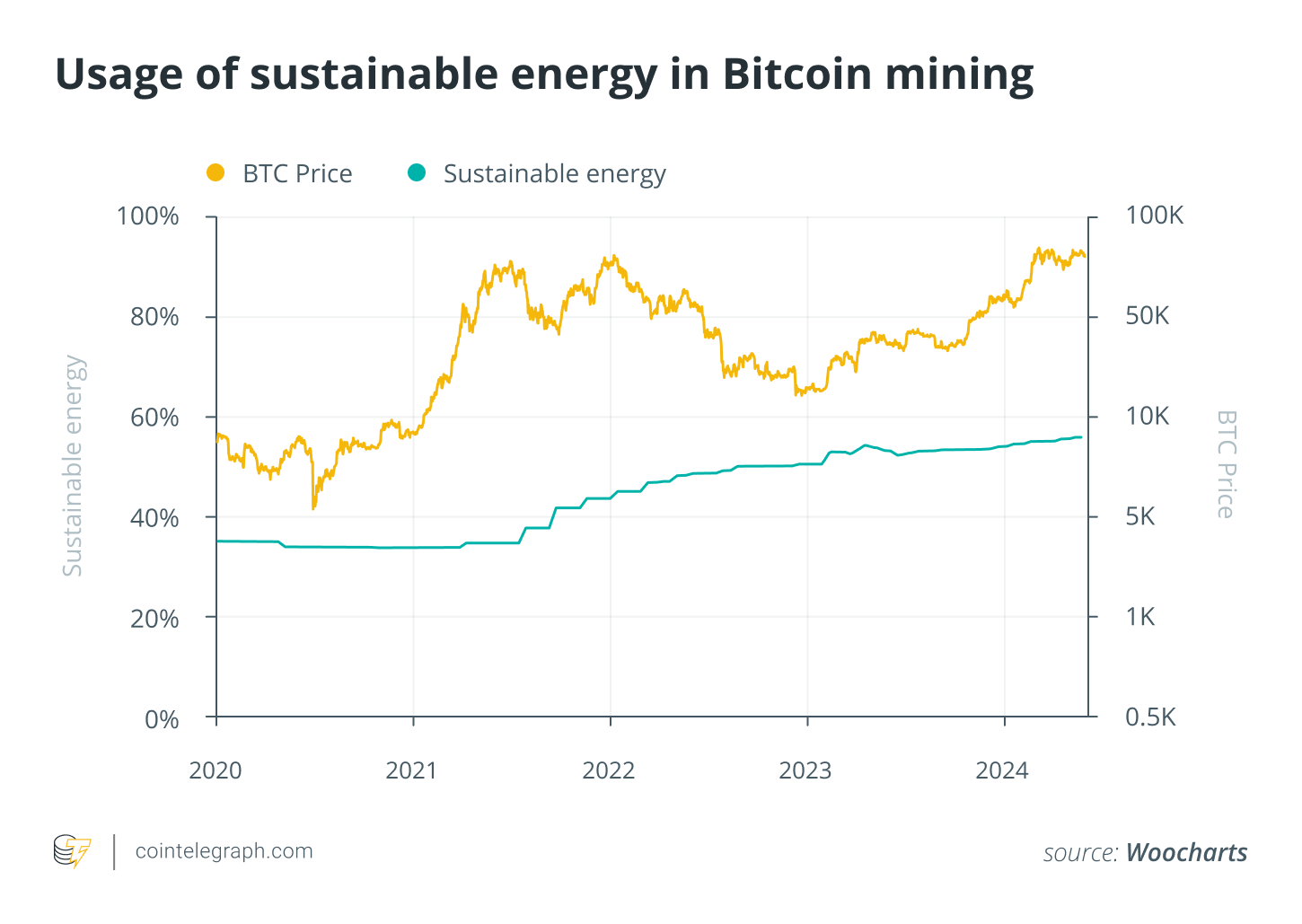 Bitcoin mining’s sustainable energy usage reached an all-time high of over 55%, according to the above graph modeled by climate tech venture capitalist Daniel Batten and Bitcoin analyst Willy Woo.