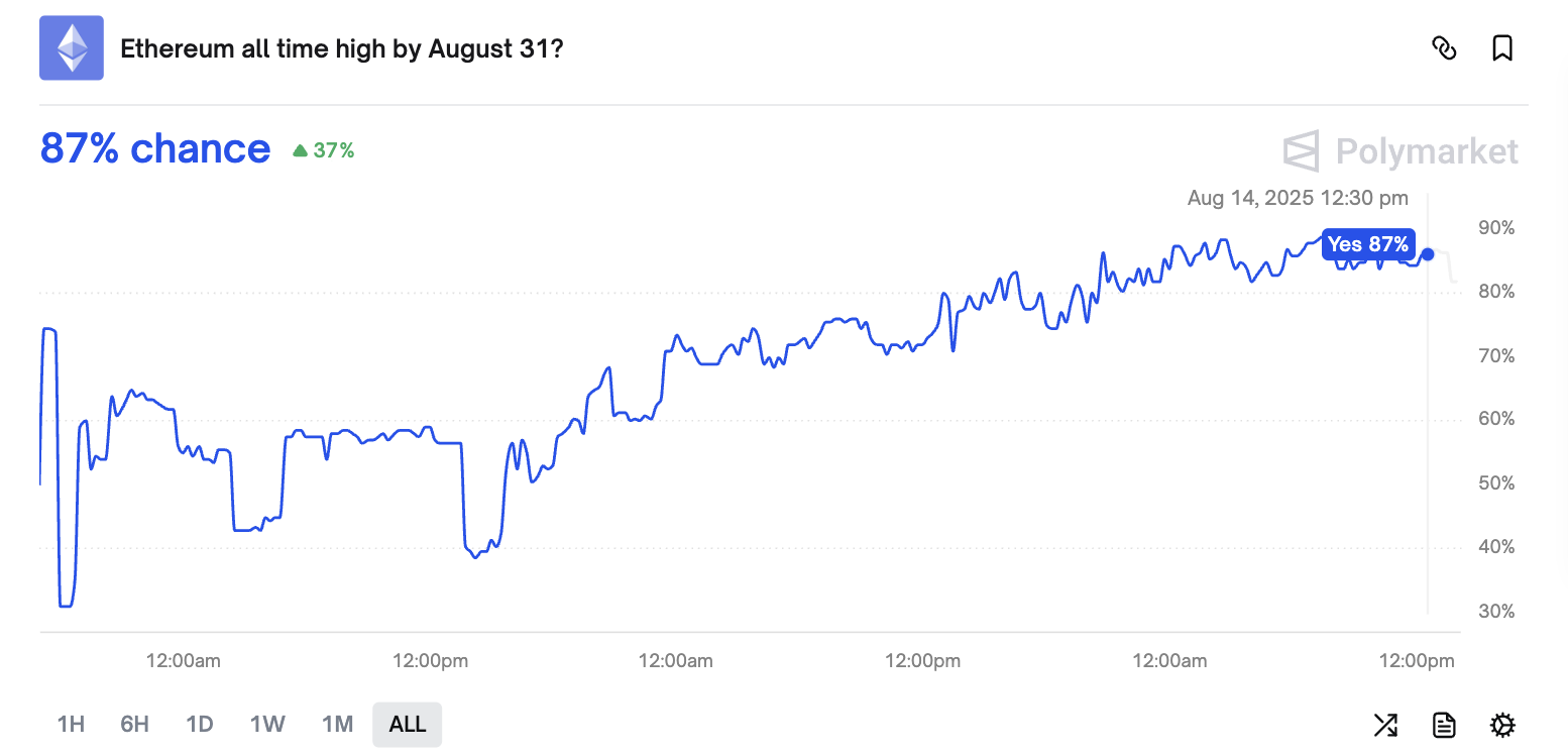 Polymarket users predict an 87% chance that Ether will hit a new all-time high by Aug. 31.