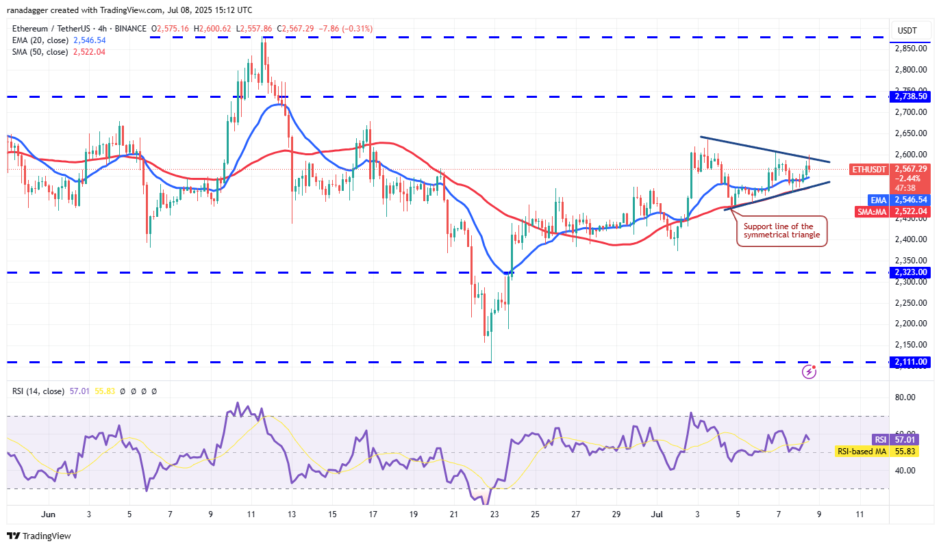 The ETH/USDT pair has formed a symmetrical triangle pattern on the 4-hour chart, indicating indecision between the bulls and the bears. The advantage will tilt in favor of the bulls on a break and close above the triangle. If that happens, the pair could surge toward the pattern target of $2,751.