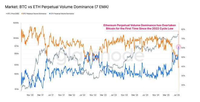 BTC vs ETH perps volume dominance. Source: Glassnode/X
