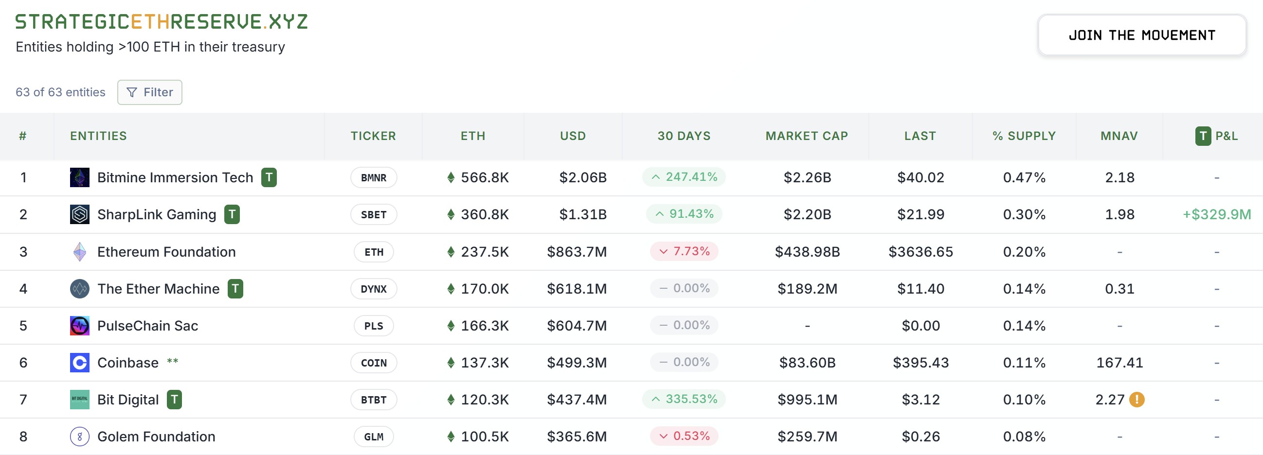 Strategic accumulation of Ether has also surged in recent weeks. Holdings among large corporations have nearly doubled, rising to 2.3 million from 1.2 million in four weeks. Tom Lee’s investment firm, Bit Mine, which has acquired 266,119 ETH ($970 million) over the past week, now holds 566,776 ETH, valued at $2.06 billion, making it the largest Ether treasury among institutional entities.
