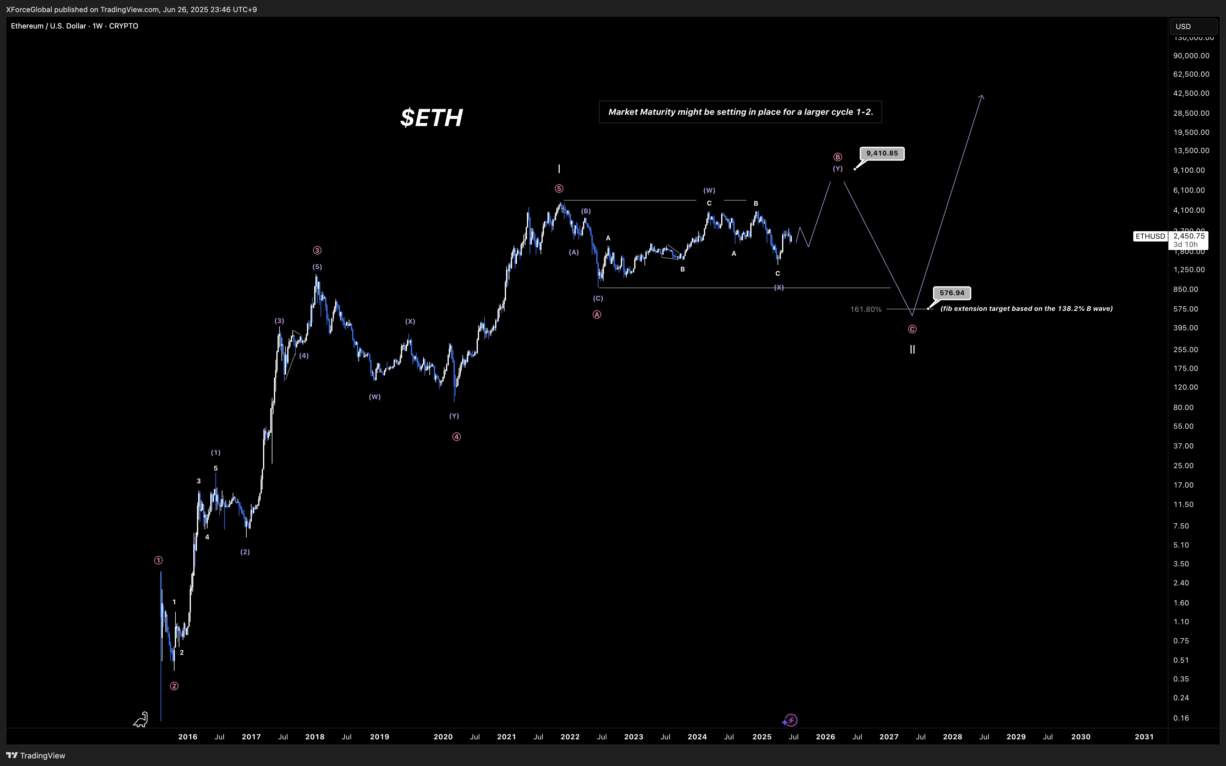 One perspective comes from Elliott Wave analysis, a model positing that market prices move in five recurring, psychology-driven wave patterns. According to the XForceGlobal analysis posted a month ago (already partly validated, though a bit ahead of the forecast), ETH appears to be advancing through a third impulsive wave. If the pattern holds, this phase could peak around $9,000 by early 2026, provided macro conditions remain supportive. That would mark Ethereumโs next major breakout before the onset of the next market downturn.