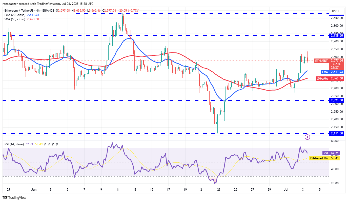 Buyers pushed the price above the $2,521 resistance, opening the gates for a rally to $2,680. The upsloping 20-exponential moving average and the relative strength index (RSI) in the positive territory indicate an advantage to buyers. Dips are likely to find buyers at the 20-EMA. If that happens, the possibility of a rally to $2,738 increases.