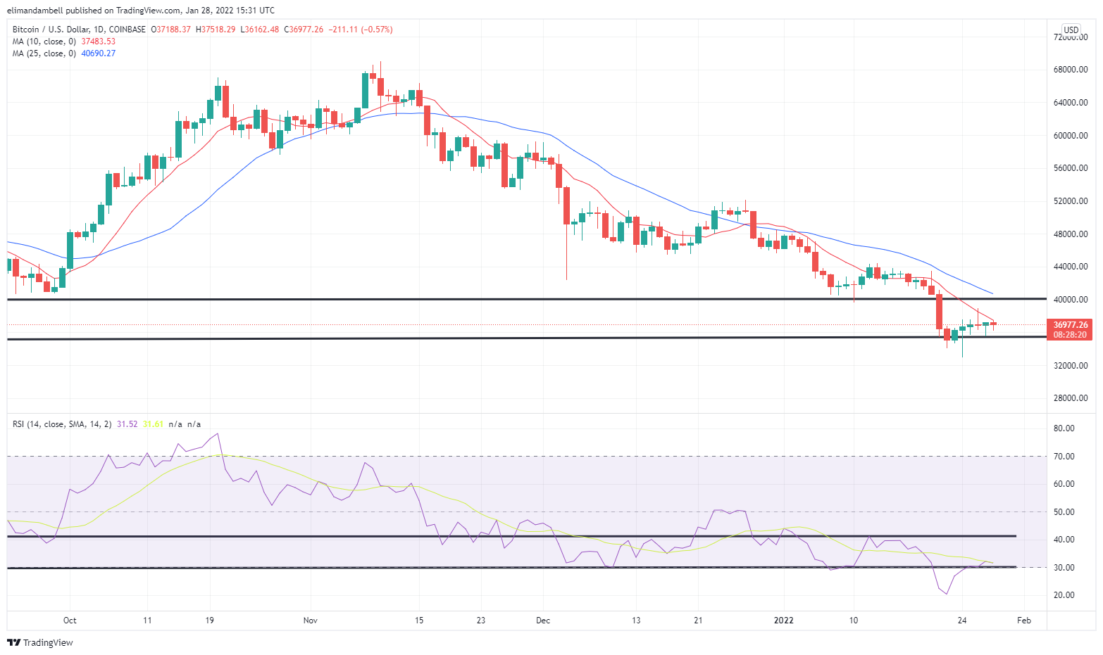 The move comes as bitcoin appears to be trading within a range of support ($35,600.00) and resistance ($38,510.00), in other words consolidating, after recent swings in price.