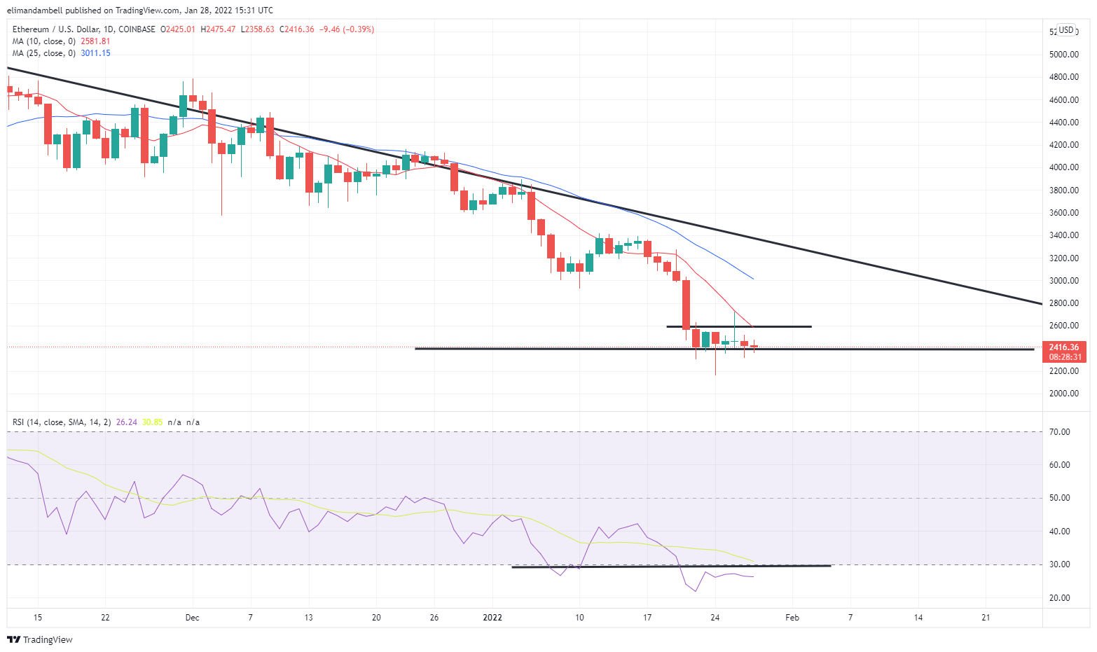 Friday’s decline sees ETH/USD fall for a second consecutive session, as it continues to trade around support of $2,400.