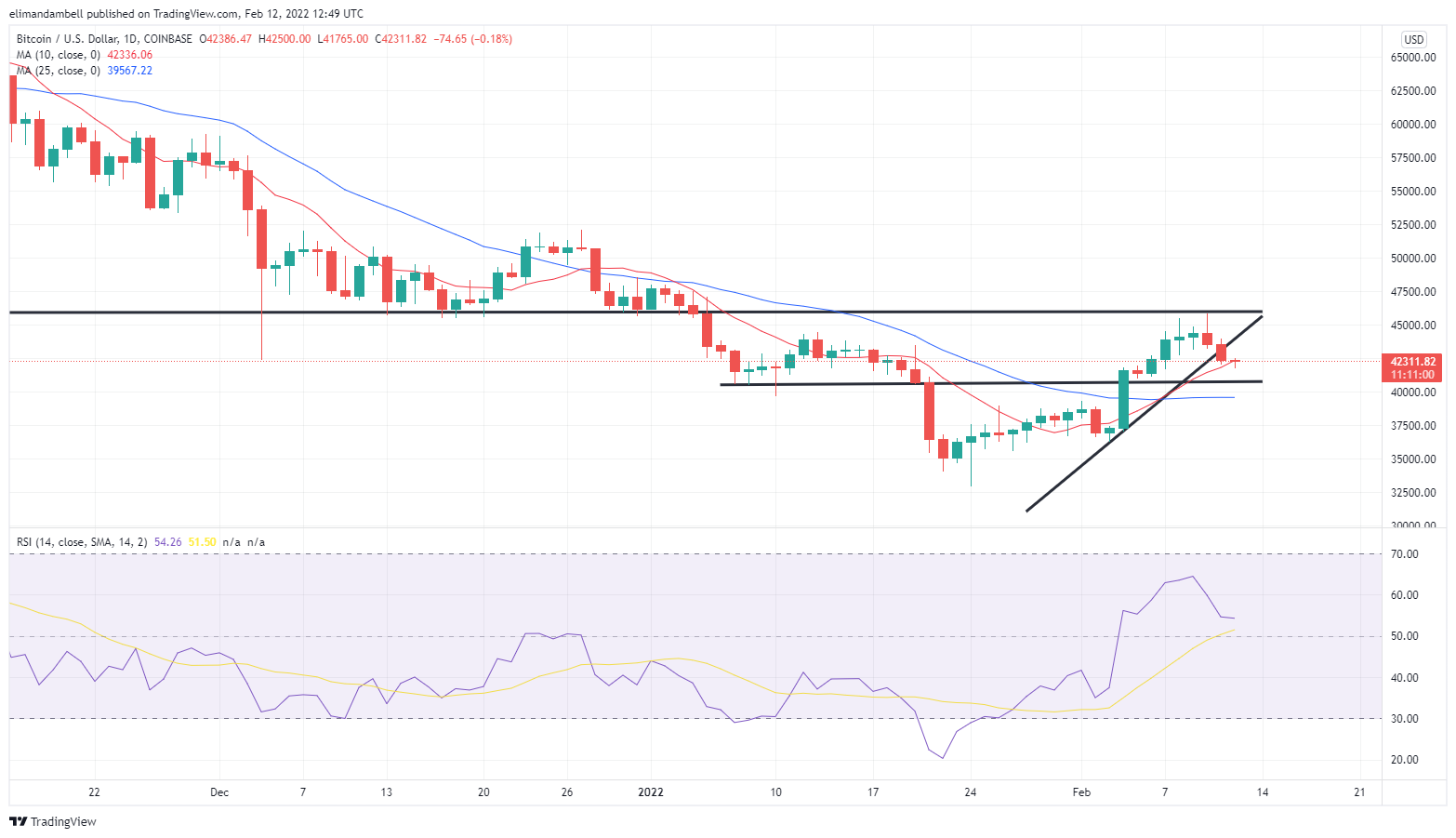BTC/USD fell to an intraday low of $41,892.20 on Saturday, following a peak of $43,810.83 during yesterday’s session.