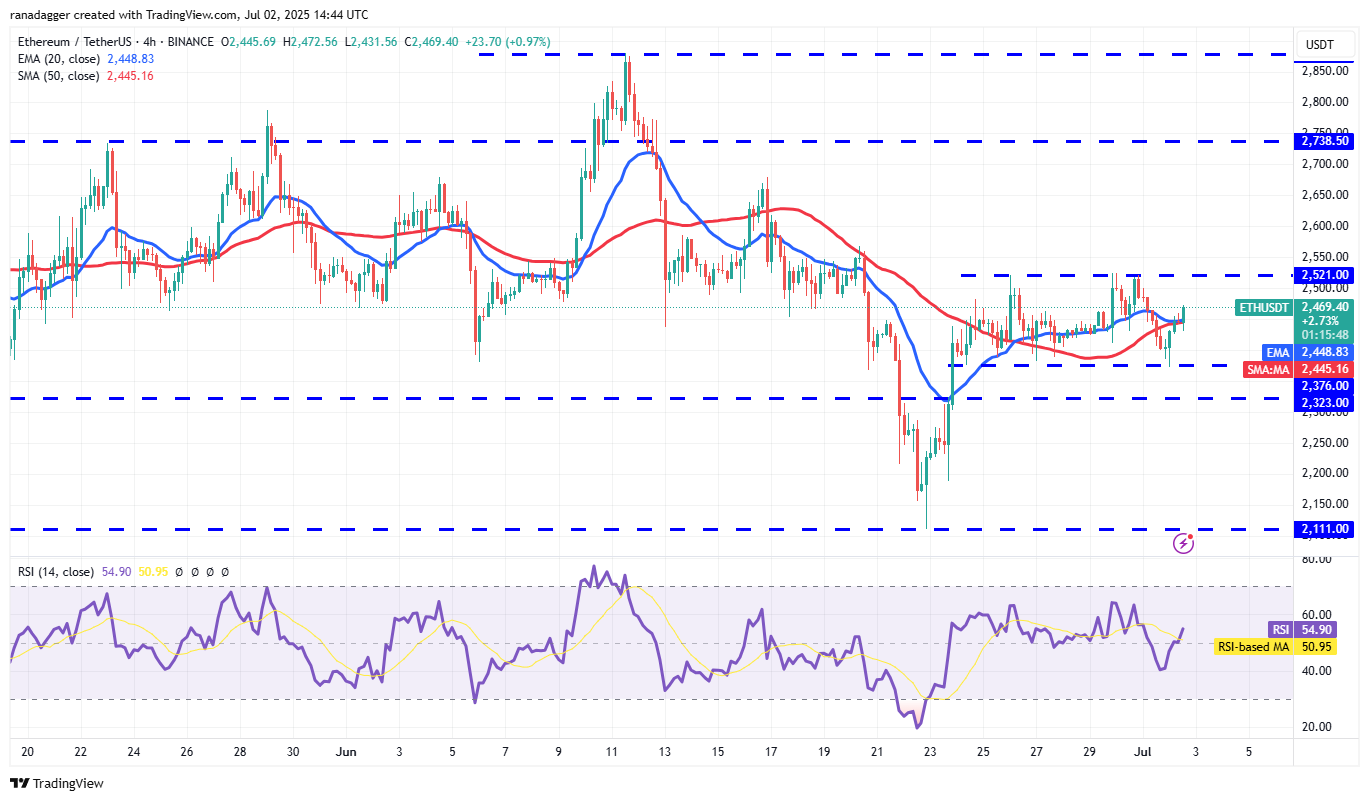 Ether has been trading between the 50-day simple moving average ($2,528) and the horizontal support at $2,323 for the past few days.