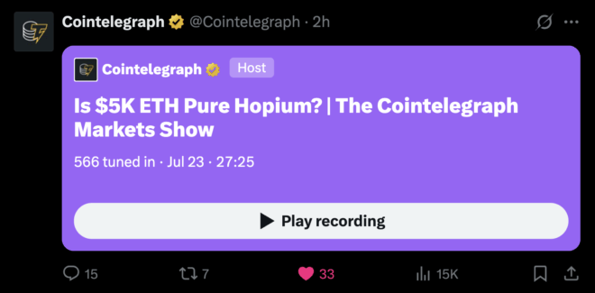 — Cryptox Markets & Research (@CointelegraphMT) July 22, 2025