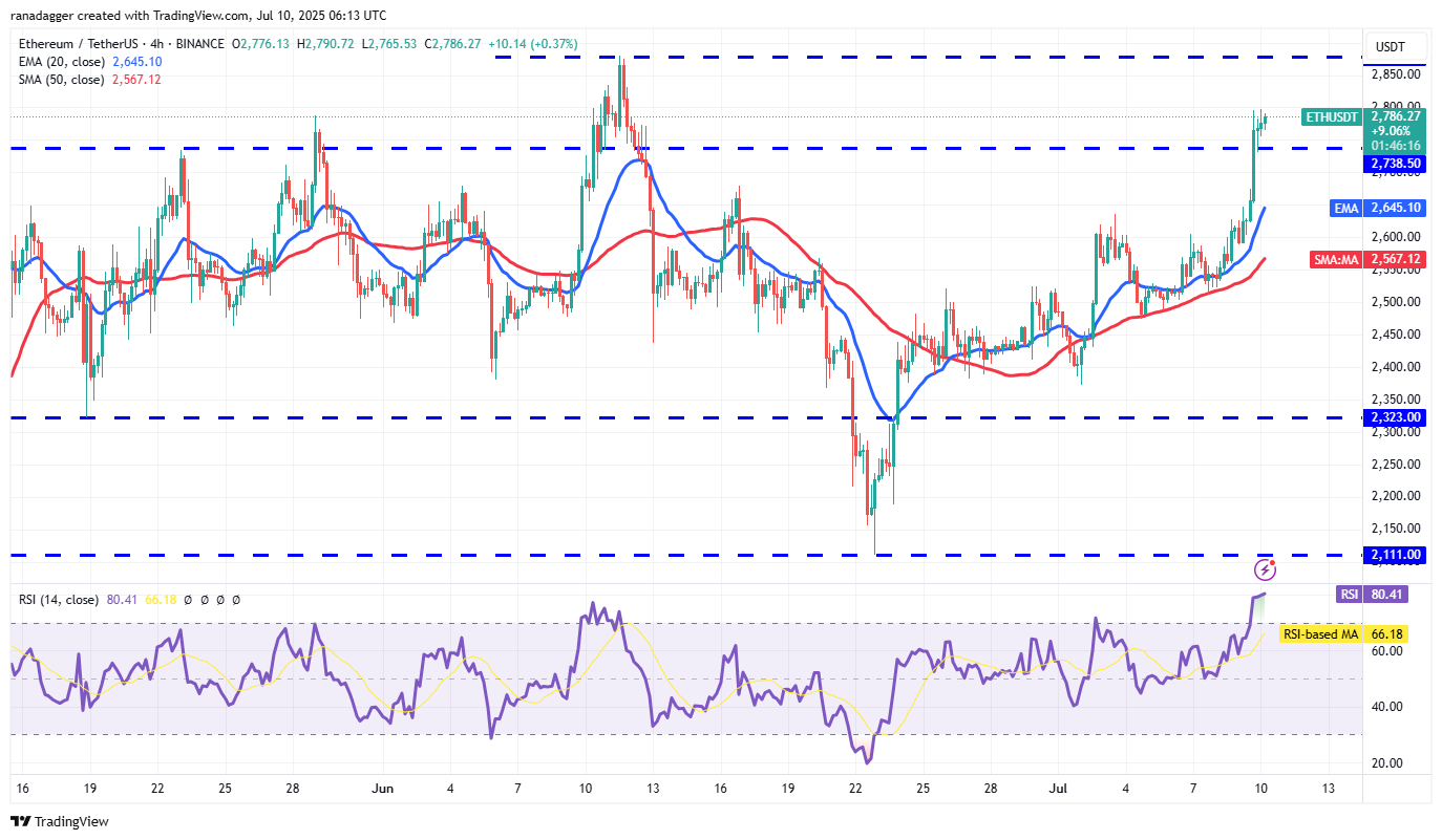 The pair’s rise above $2,800 pushed the RSI into overbought territory, suggesting a pullback or consolidation in the near term. If the price slips below $2,738, the pair could reach the 20-EMA on the 4-hour chart. A solid bounce off the 20-EMA shows that the sentiment remains positive and the bulls are buying on dips. That increases the likelihood of a rally to $2,879.