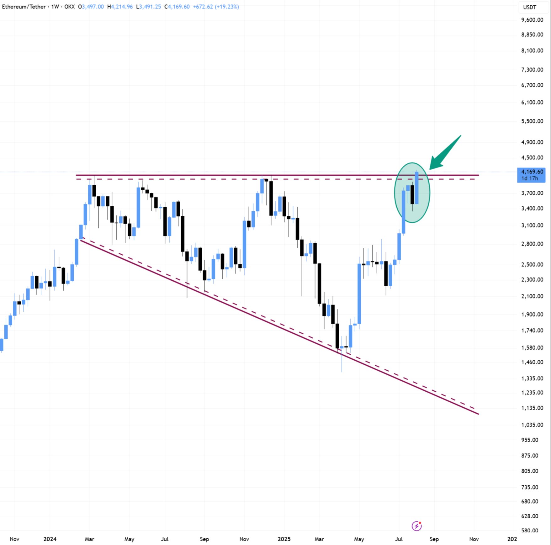 “But what’s next? $ETH needs a strong weekly close above this level now. If that happens, a new ATH will happen in 1-2 weeks.”