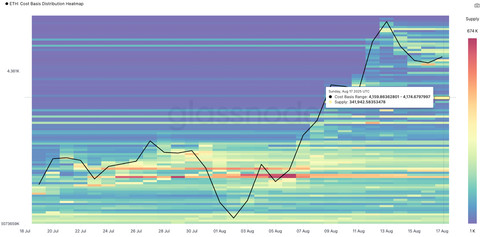 This level aligns with the 20-day exponential moving average (EMA) at $4,140, and $4,150 is key support, where 341,000 ETH tokens were accumulated, per Glassnode’s Cost basis distribution heatmap.