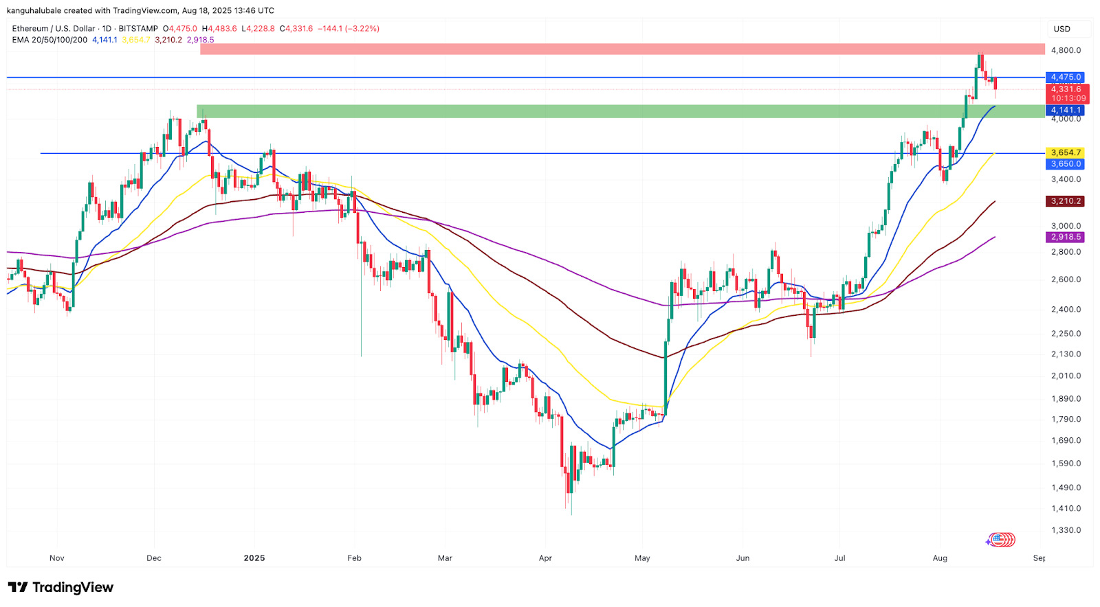 “As long as the weekly close holds the $4K–$4.25K region, I treat dips as consolidation,” said popular analyst Demi-Defi in an Aug. 18 post on X, adding that a weekly close below $4,150 could trigger a “deeper drop” to the $3,650–$3,750 region.