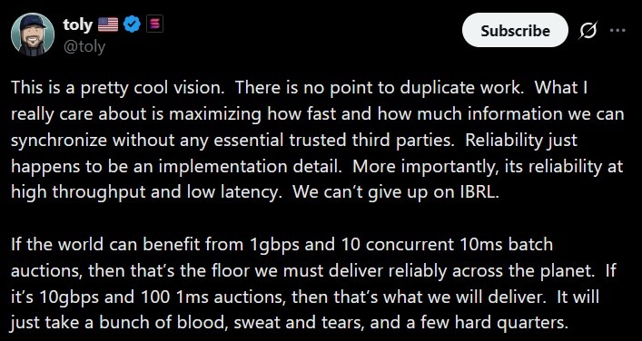 “If the world can benefit from 1gbps and 10 concurrent 10ms batch auctions, then that’s the floor we must deliver reliably across the planet.”