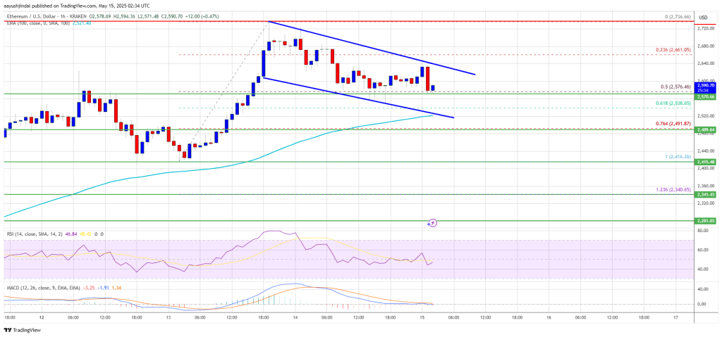 If Ethereum fails to clear the $2,630 resistance, it could start a fresh downside correction. Initial support on the downside is near the $2,575 level. The first major support sits near the $2,500 zone or the 76.4% Fib retracement level of the upward move from the $2,415 swing low to the $2,736 high.