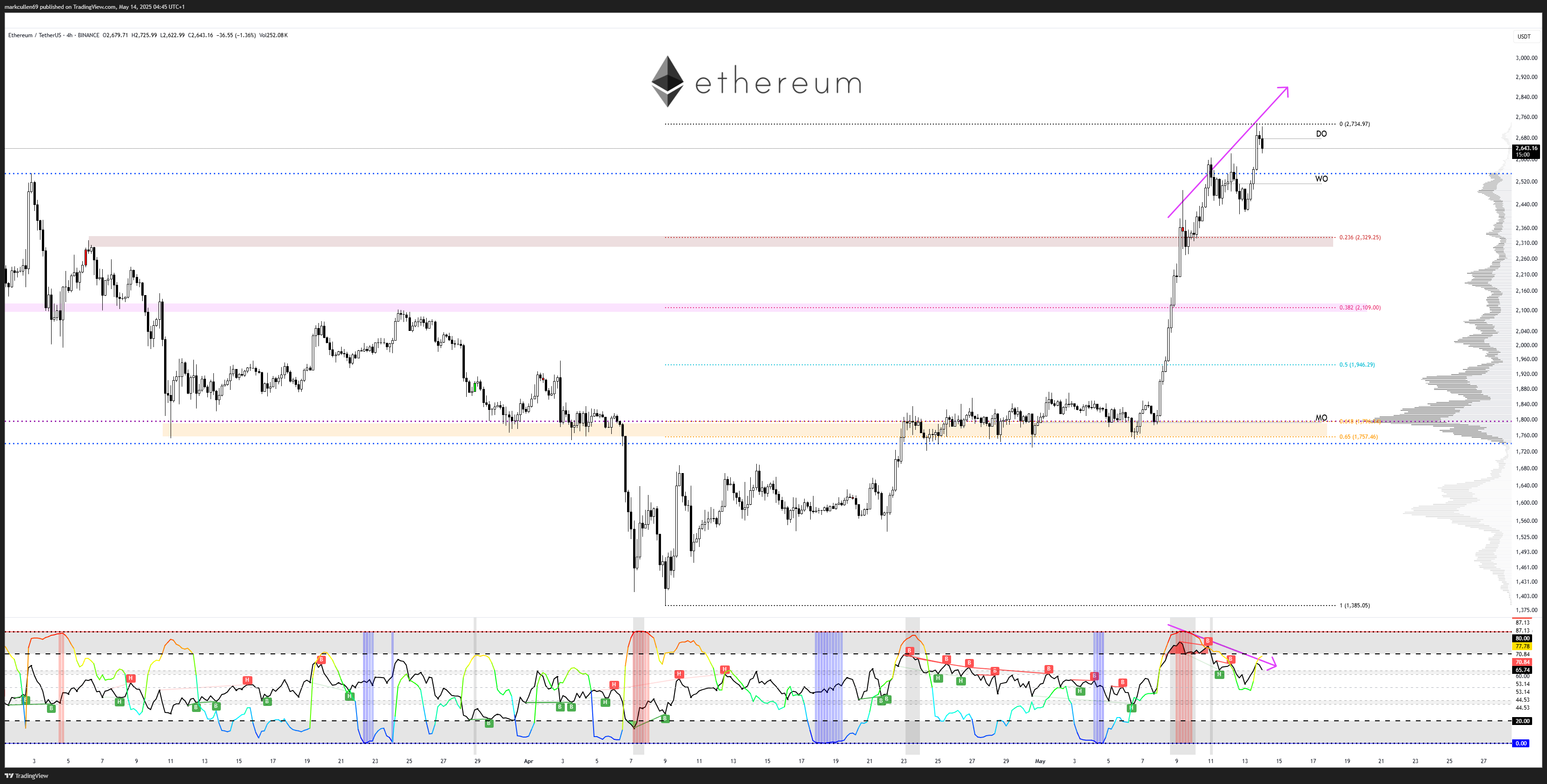 On the four-hour ETH/USD chart, a classic bearish divergence is emerging, where Ethereum’s price continues to print higher highs, but momentum indicators trend lower.
