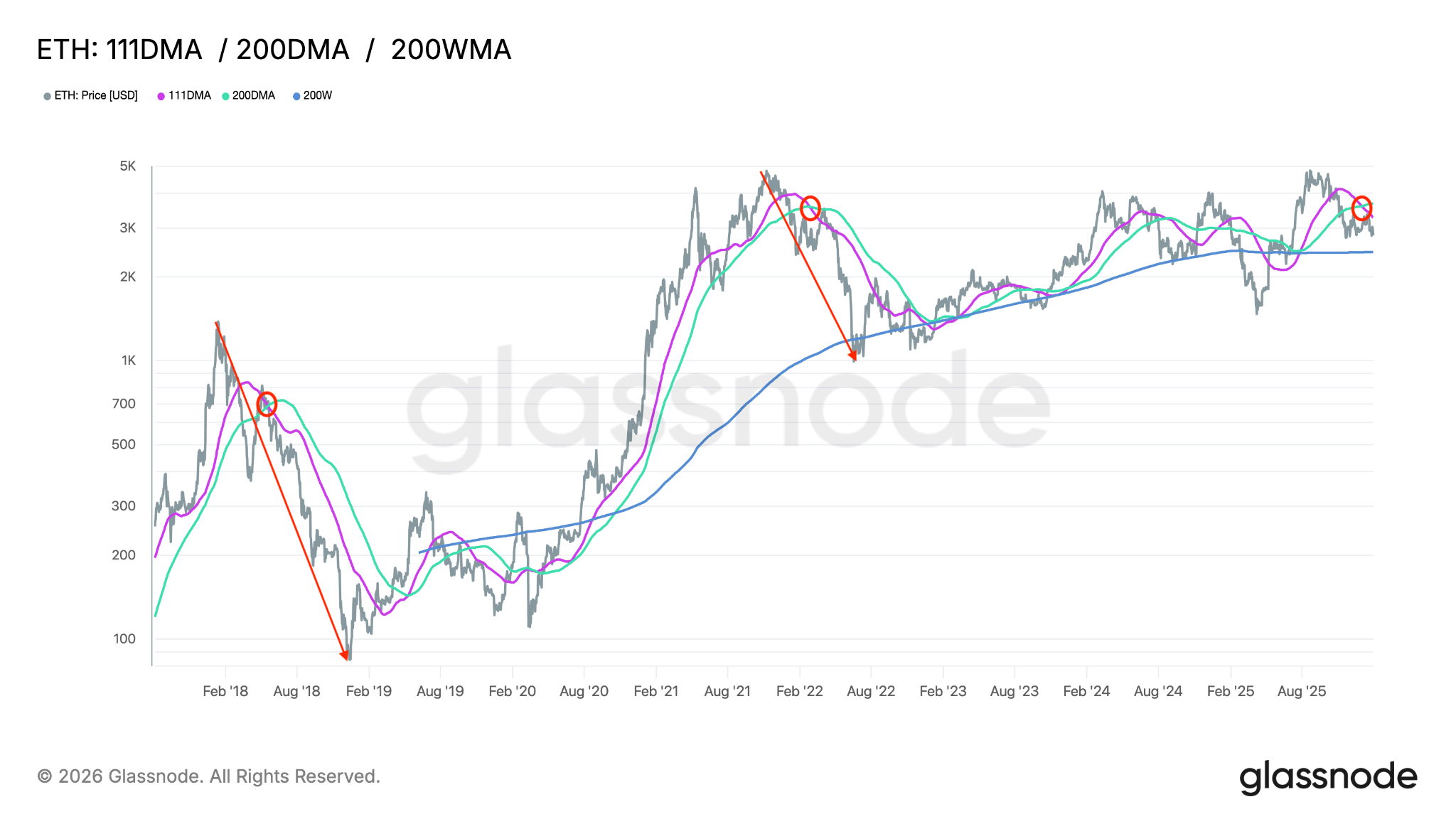 Meanwhile, chart technicals show that the 111-day moving average (MA) is currently trading below the 200-day MA. Similar crossovers triggered the start of deeper ETH price drawdowns during the 2018 and 2022 bear markets, as shown in the chart below.