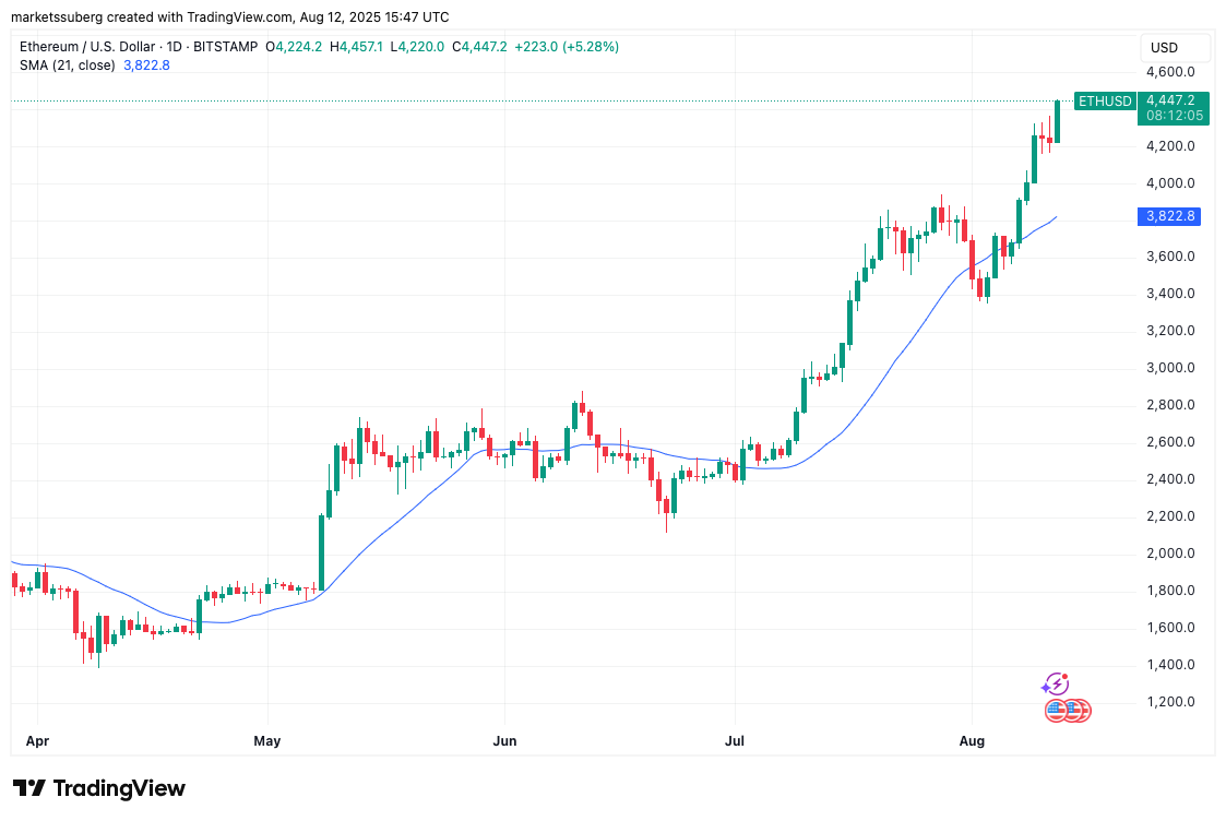 Ether (ETH) neared $4,500 Tuesday as major corporate buying plans gave the largest altcoin another major boost.
