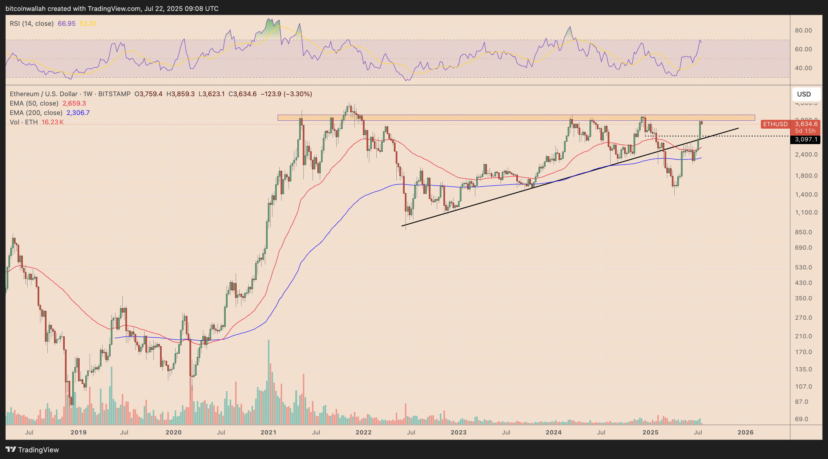 A move toward $3,000 would still place Ethereum comfortably above its multi-year ascending trendline, as shown on the weekly chart.