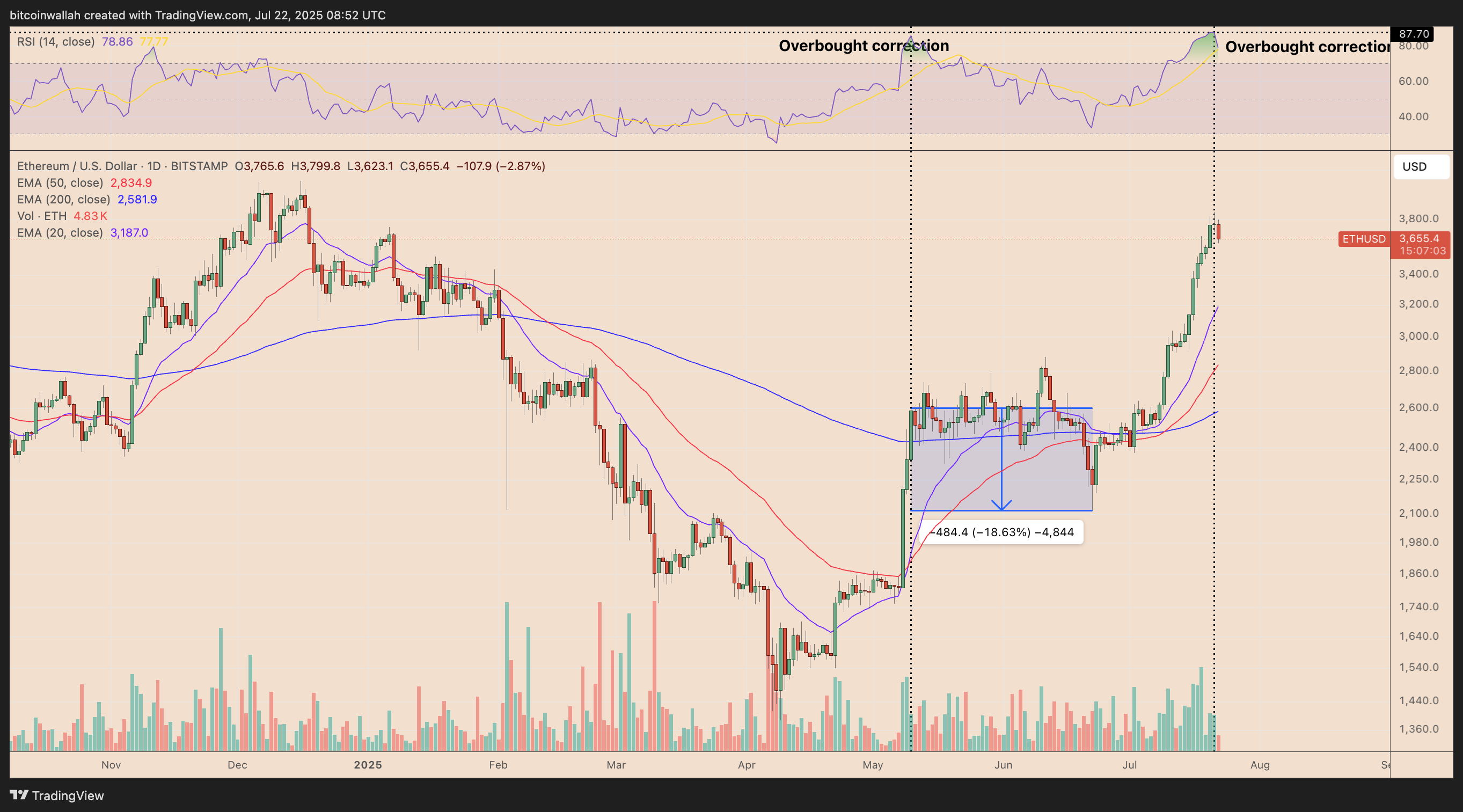 Historically, such readings have preceded short-term pullbacks, as seen in late May, when ETH corrected 18.6% after a similar RSI spike.