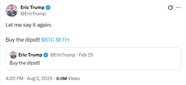 Over the weekend, Eric Trump, the son of US President Donald Trump, told his X followers to buy the ETH dip.
