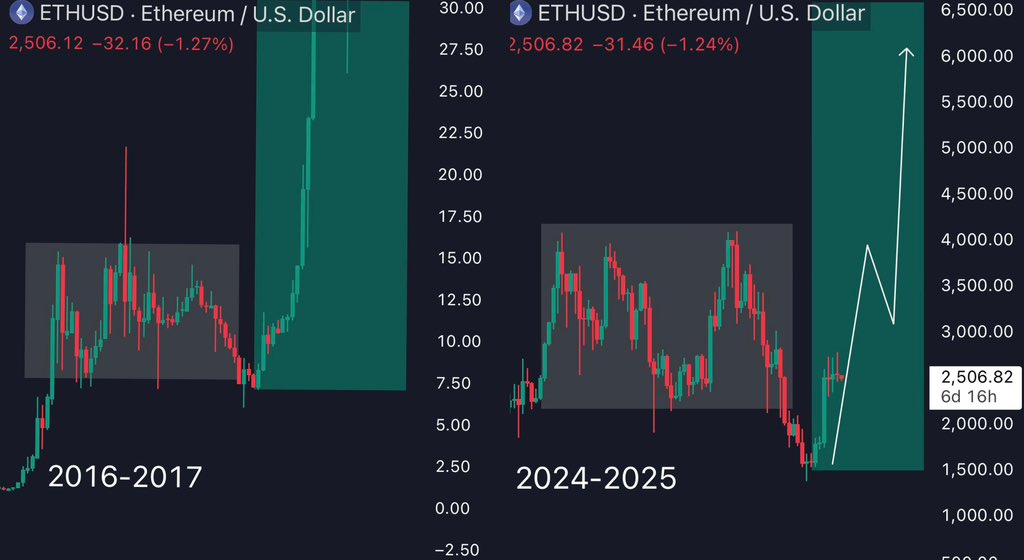 Ethereum is also repeating its 2016–2017 fractal and could rally to $5,000–$6,000 if the pattern holds.