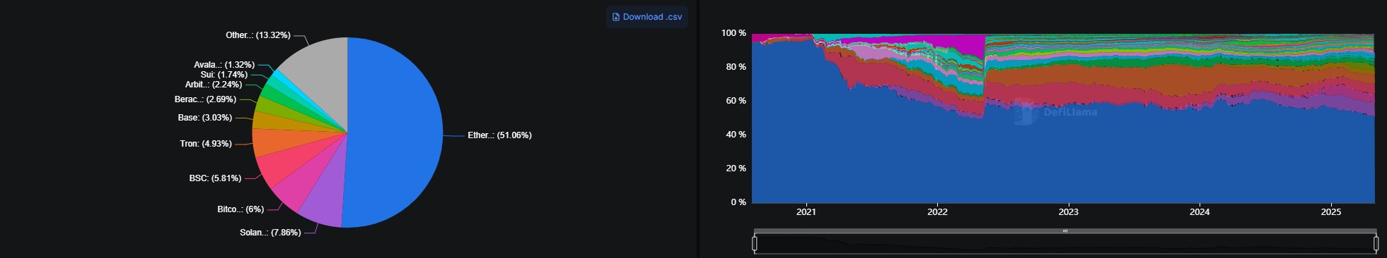 However, Ethereum’s dominance has diminished sharply since 2021, when the L1 controlled as much as 96% of aggregate TVL, the data shows.