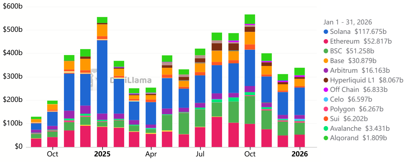 Decentralized exchanges’ monthly volumes by blockchain, USD. Source: DefiLlama