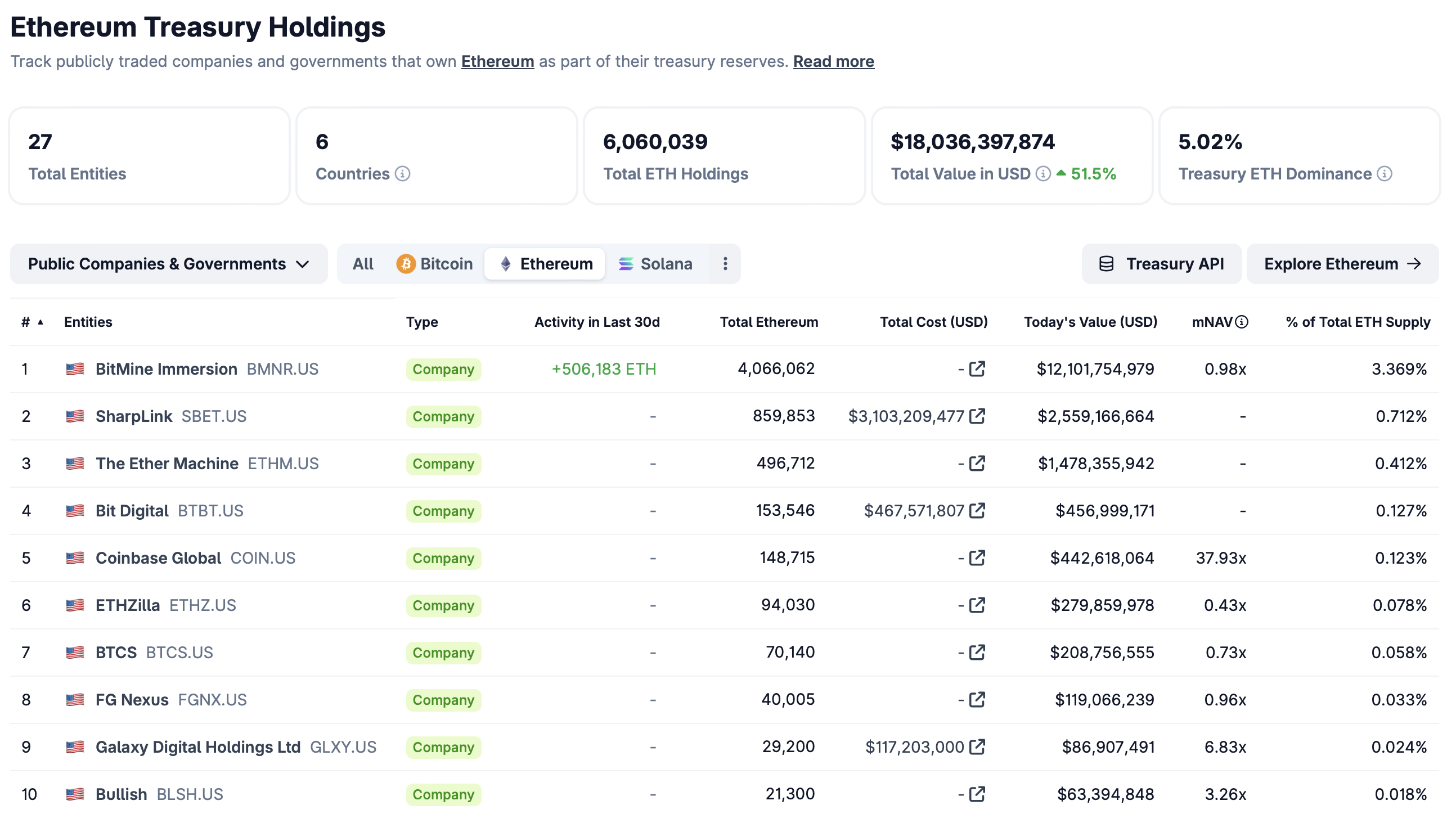 Ether has gauged similar demand from investors. According to CoinGecko data, 27 public companies collectively hold about 6 million ETH, also representing about 5% of the token’s circulating supply.