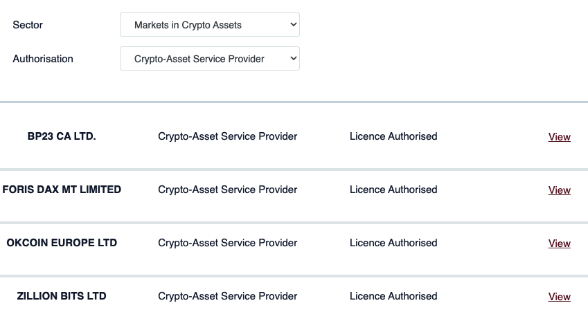 According to the MFSA register of licensed CASPs operating under MiCA, there are currently four registered companies: BP23, trading as Bitpanda; Foris Dax, trading as Crypto.com; Okcoin Europe, trading as OKX; and Zillion Bits, trading as ZBX.