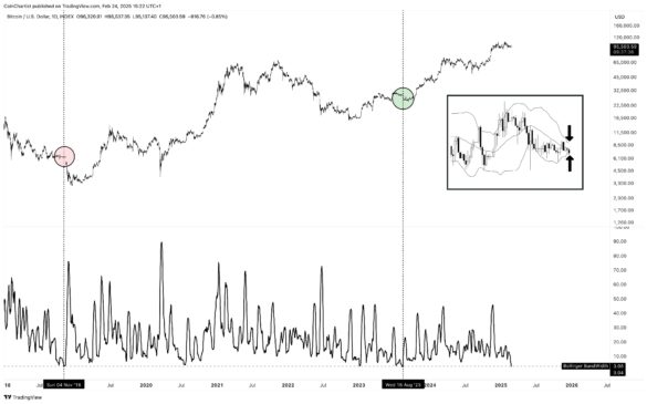 Bitcoin Bollinger Bands reach the third-tightest reading since 2018 | Source: X @tonythebullBTC
