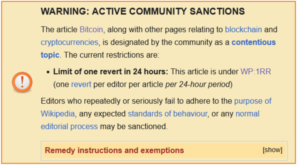 Like most entries on cryptocurrency on Wikipedia, the Bitcoin entry has been under various forms of editing “protection” for more than a decade and has been designated a “contentious topic” under “active community sanctions”.