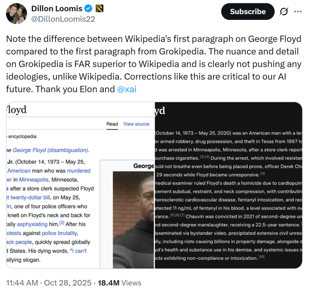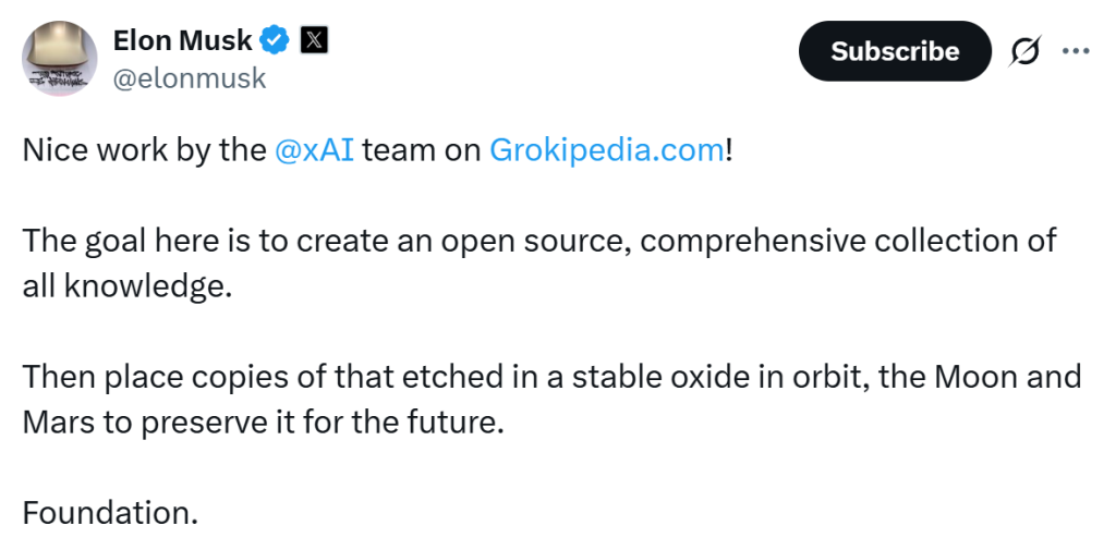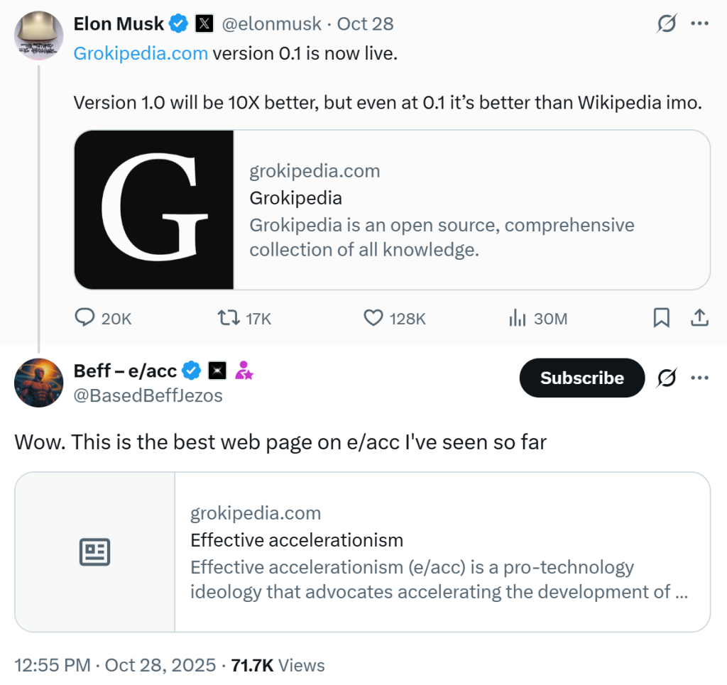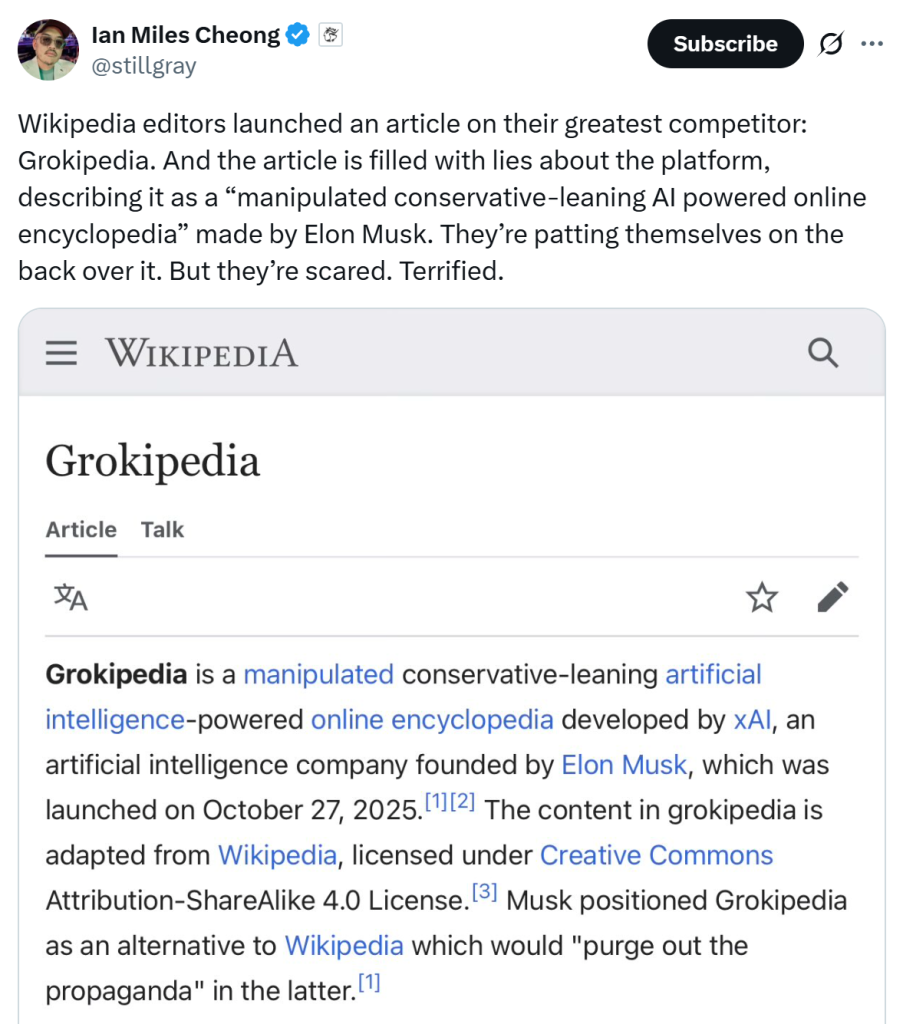 It was only at the end of September when Elon Musk announced xAI was building Grokipedia, claiming it would be a “massive improvement over Wikipedia,” and address “falsehoods” and “half-truths” on the internet.