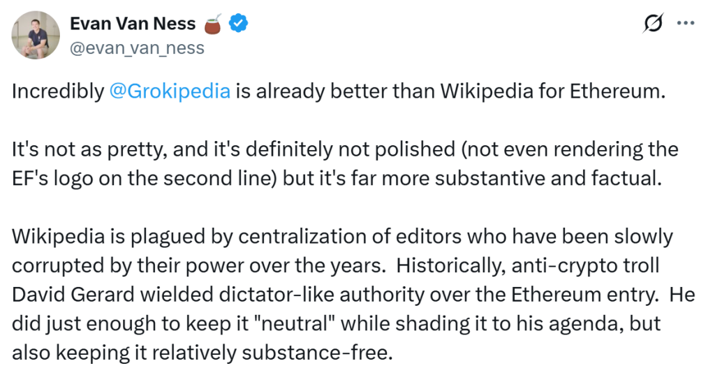 “Incredibly, Grokipedia is already better than Wikipedia for Ethereum,” says Evan Van Ness, a former member of the Ethereum Foundation and founder of “Ethereum News Weekly.”