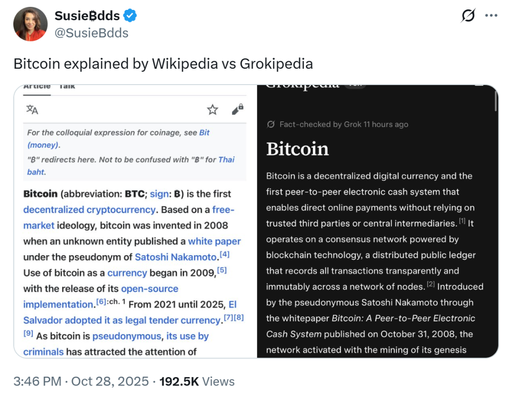 Wikipedia vs Grokipedia on crypto