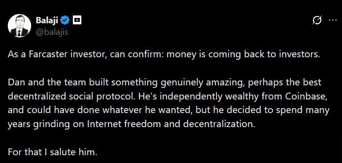 The post drew a response from Farcaster investor Balaji Srinivasan, who confirmed that investor funds were being returned. He also praised the team’s work on decentralized social infrastructure.