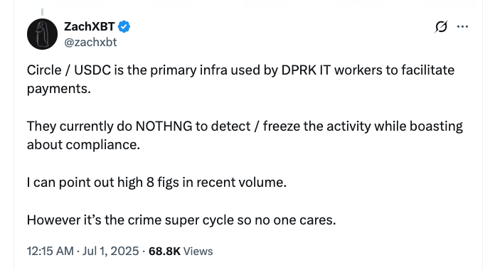Crypto sleuth ZachXBT took to X on July 1 to claim that the public stablecoin issuer Circle and its USDC (USDC) stablecoin are the “primary infra used by DPRK IT workers to facilitate payments.”